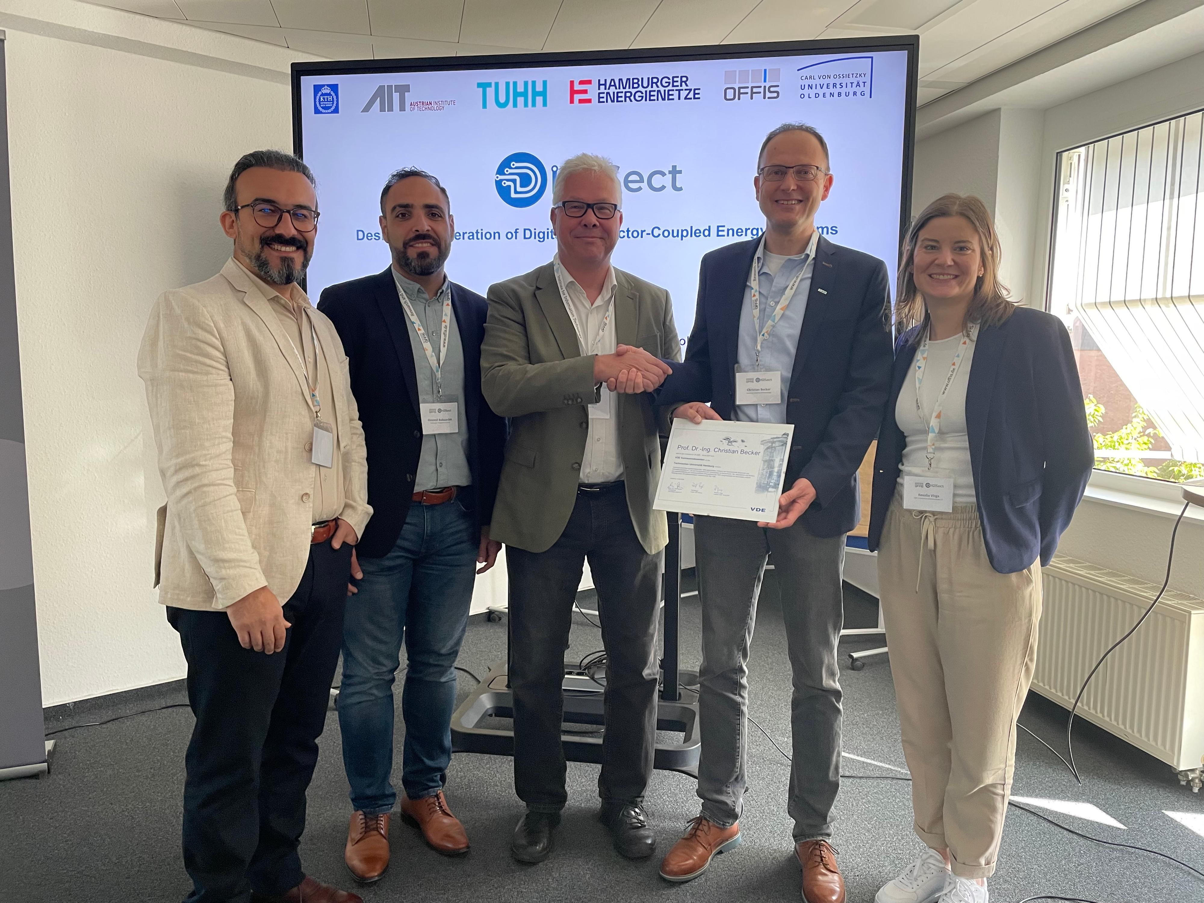 Ernennung von Prof. Dr. Christian Becker (2.v.r) als VDE Vertrauensdozent an der Technischen Universität Hamburg durch Dirk Sasson (Mitte), Vorsitzender VDE Region Nord e.V. und Rosalia Virga, Leiterin VDE Young Net. Zu den ersten Gratulanten gehören Dr.-Ing. Payam Teimourzadeh Baboli (l.), Oberingenieur am Institut für Elektrische Energietechnik an der TUHH und Davood Babazadeh (2.v.l.), Innovation Manager bei Hamburger Energienetze.