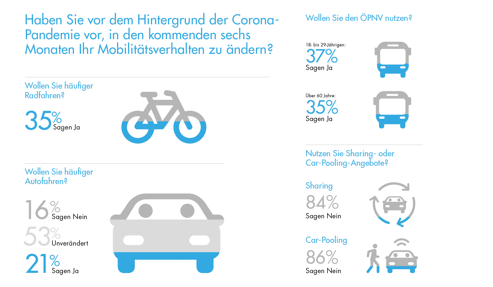 Dass MaaS im Trend liegt, zeigen auch die Ergebnisse einer Umfrage, die forsa im Auftrag der Standortinitiative „Deutschland – Land der Ideen“ Mitte des Jahres 2020 durchgeführt hat. Große beziehungsweise sehr große Chancen sehen 71 Prozent der Befragten vor allem darin, Mobilität effizienter zu gestalten – konkret durch nahtlose Anbindungen, weniger Leerfahrten oder Zeitersparnis auf täglichen Wegen. 69 Prozent erwarten eine Verbesserung der Verkehrssicherheit, 67 Prozent die Optimierung bedarfsgerechter Mobilität. Durchschnittlich 57 Prozent gehen davon aus, dass ein vernetztes Mobilitätsangebot zur Erreichung der Nachhaltigkeits- beziehungsweise Klimaschutzziele beitragen kann. Als im März die Maßnahmen zur Eindämmung der Corona-Pandemie in Deutschland einsetzten, trat jedoch erst einmal auch das Mobilitätsbedürfnis auf die Bremse: Insgesamt 82 Prozent der von „Deutschland – Land der Ideen“ Befragten haben angegeben, insgesamt seltener als zuvor unterwegs gewesen zu sein. Aus Klimasicht besonders problematisch: 21 Prozent wollen künftig verstärkt den Pkw nutzen.